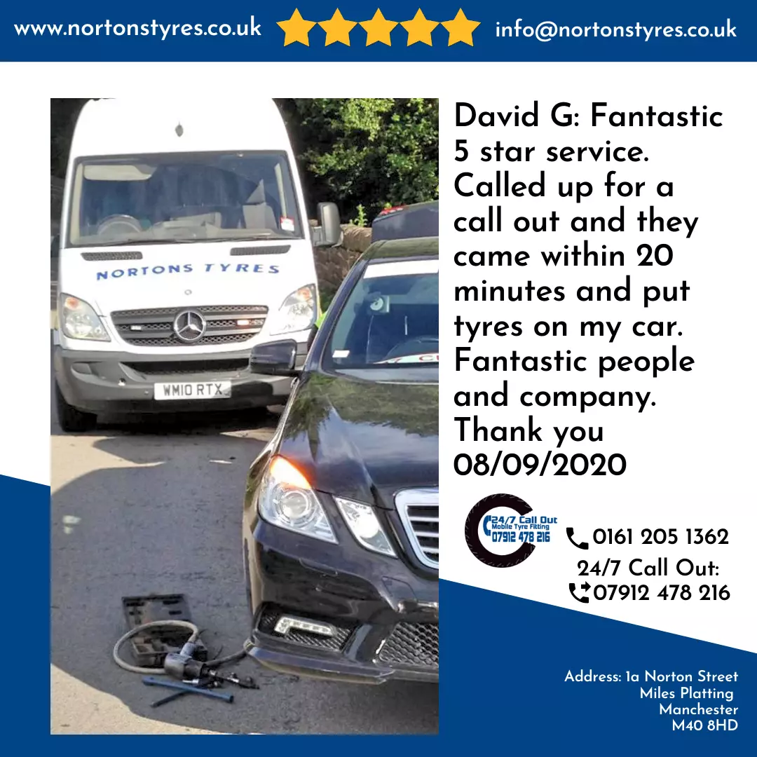David G: Fantastic 5 star service. Called up for a call out and they came within 20 minutes and put tyres on my car. Fantastic people and company. Thank you 08/09/2020