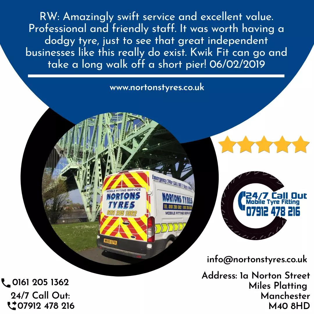 RW: Amazingly swift service and excellent value. Professional and friendly staff. It was worth having a dodgy tyre, just to see that great independent businesses like this really do exist. Kwik Fit can go and take a long walk off a short pier! 06/02/2019